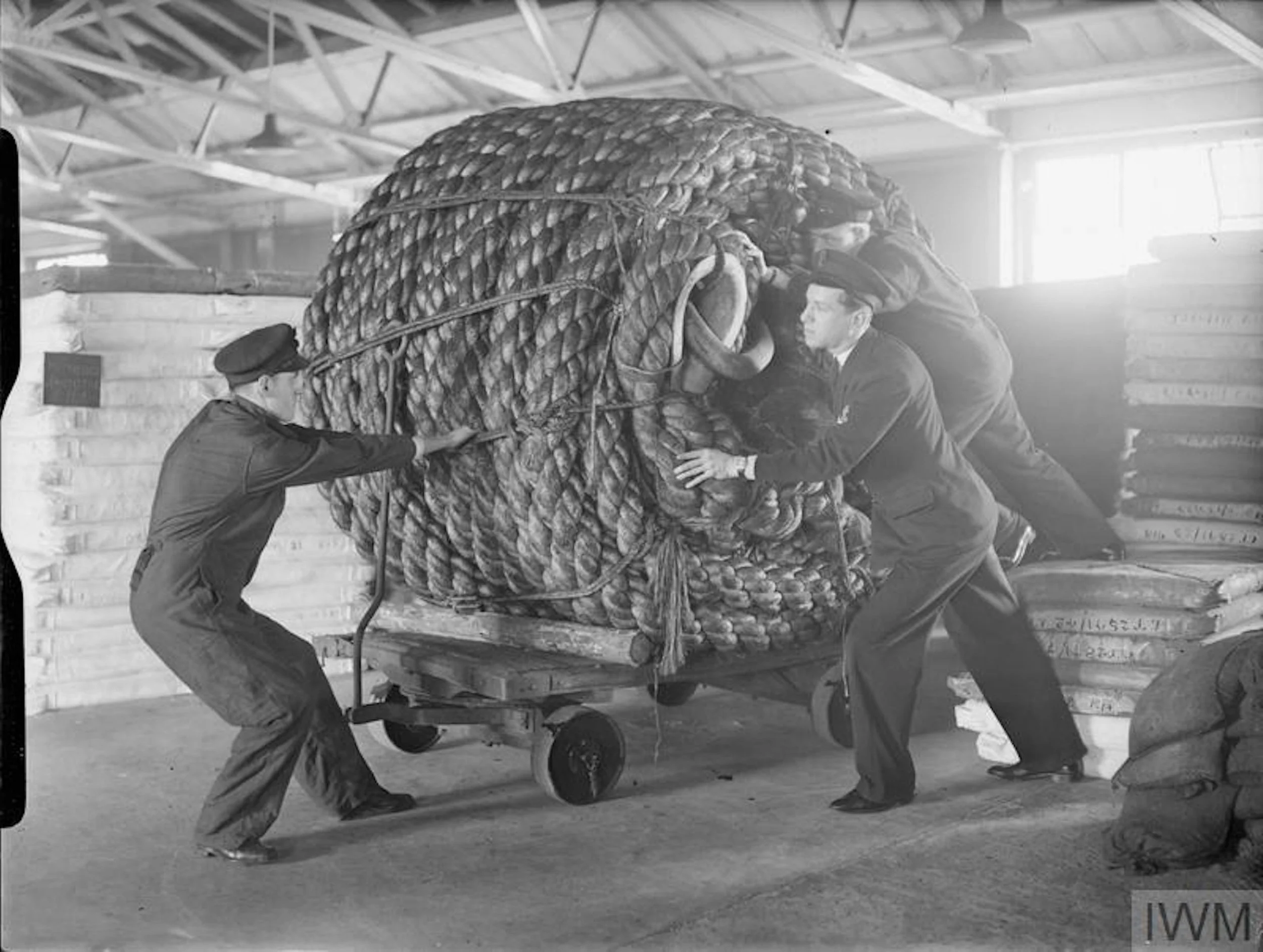 Figure 8. Supply ratings handling coil of 16-inch towing hawser (rope) at the Naval Stores Department, Nore, Harwich, c. 1940. Photo by Lt. J. E. Russell. A 16341, Admiralty Official Collection. Imperial War Museum.